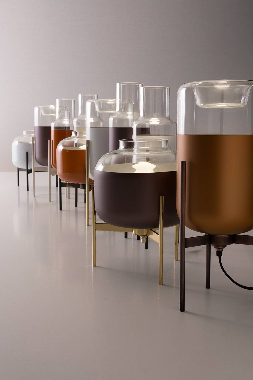 Pyrex and blown glass, hand worked top steel, brass, precious and traditional materials, quality craftmanship and finishes of the vesoi table lamps, are uniqueness of thought, a minimal and essential design, the Italian taste since 1981.