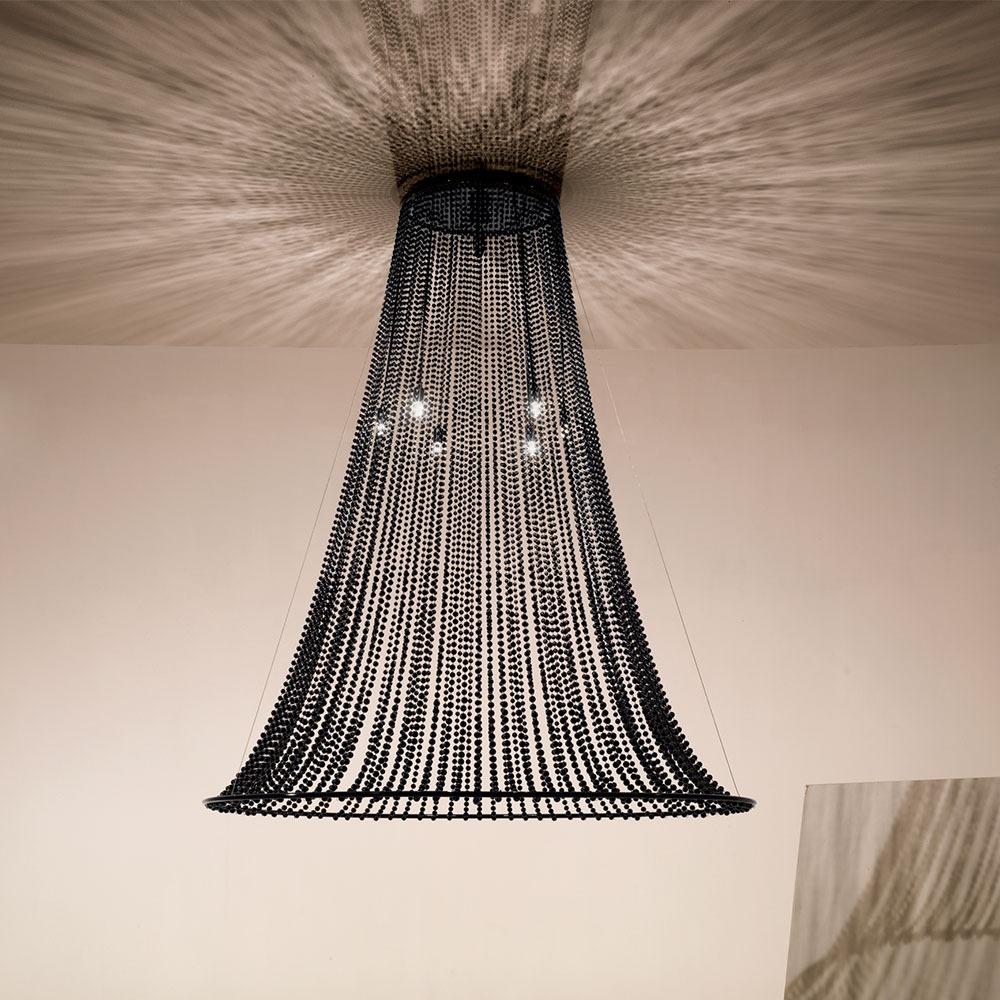 plafonnier avec diffuseur en acier AISI 430 avec une finition brillante naturelle. éléments en verre rassemblés en chaînes en couleur naturelle ou noire. également en version suspension réglable en hauteur sur des câbles de maintien en acier.