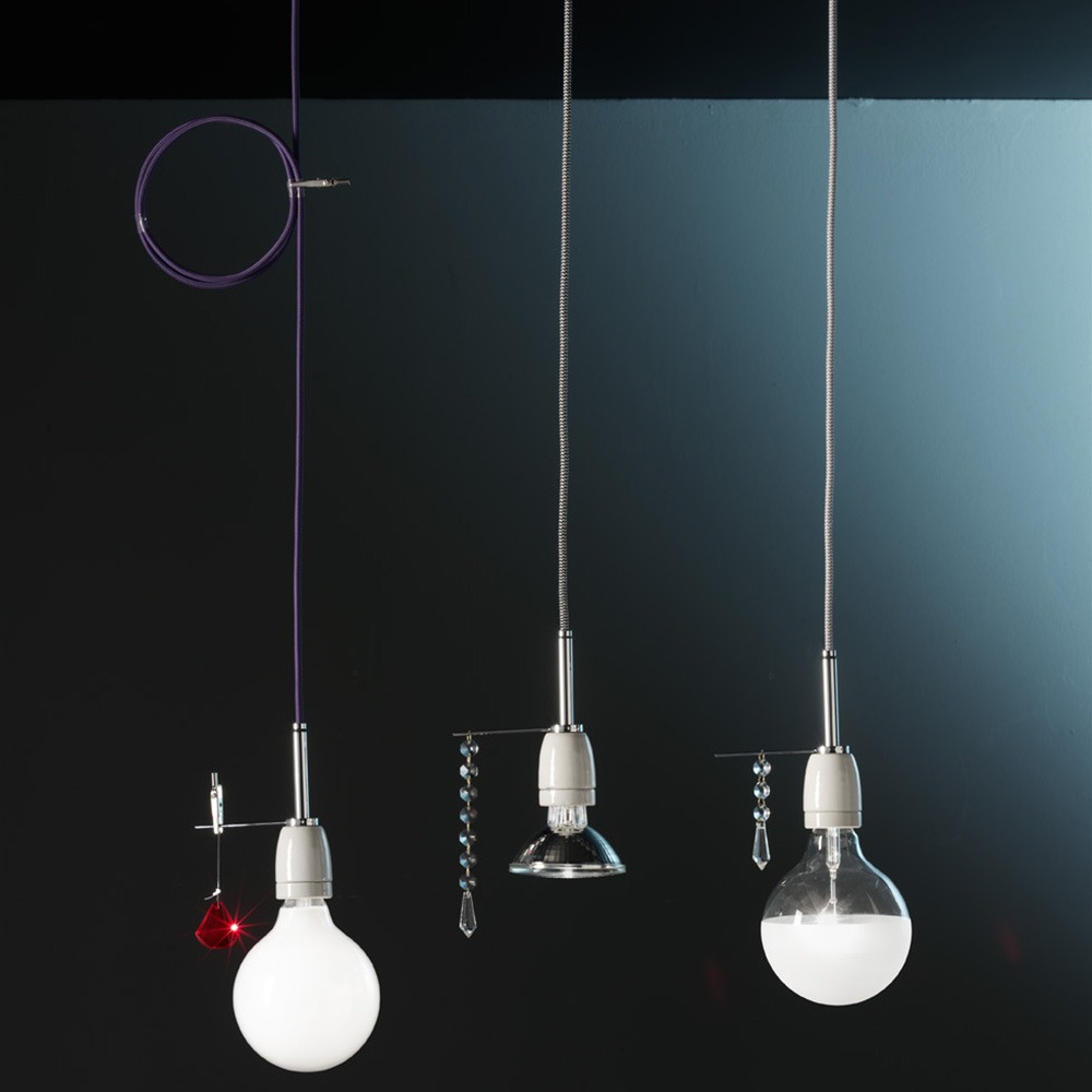 Gerät mit Fassung aus weißer Keramik und speziellem Elektrokabel mit Stoffbezug. Details aus Stahl mit totalblack und totalwhite lackierter Ausführung.