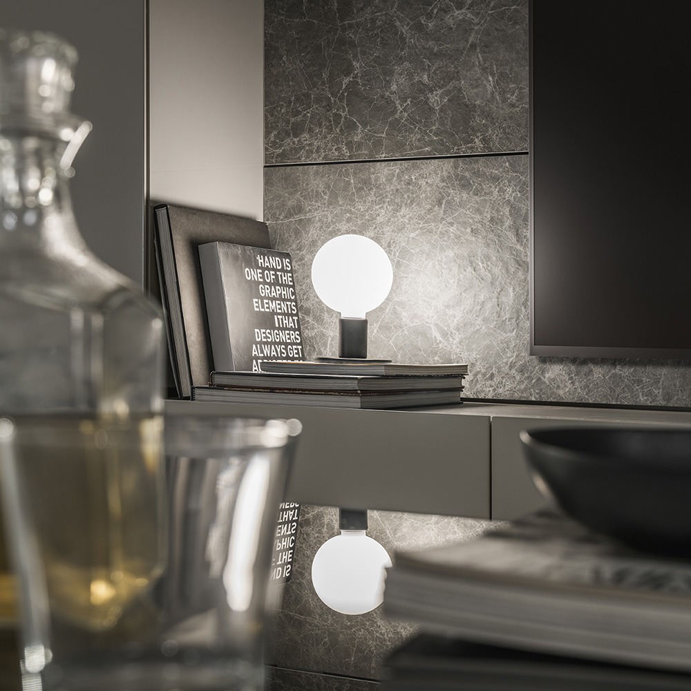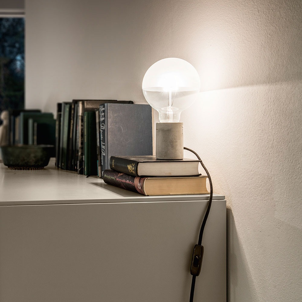 Tisch-, Wand-, Decken- und Pendelleuchte mit Abdeckung und Körper aus gegossenem Naturbeton und mit schwarzem Stoff überzogenem Spezial-Elektrokabel. Auch mit integrierter LED. Wandversion mit LED-Signallicht und Doppelzündung.