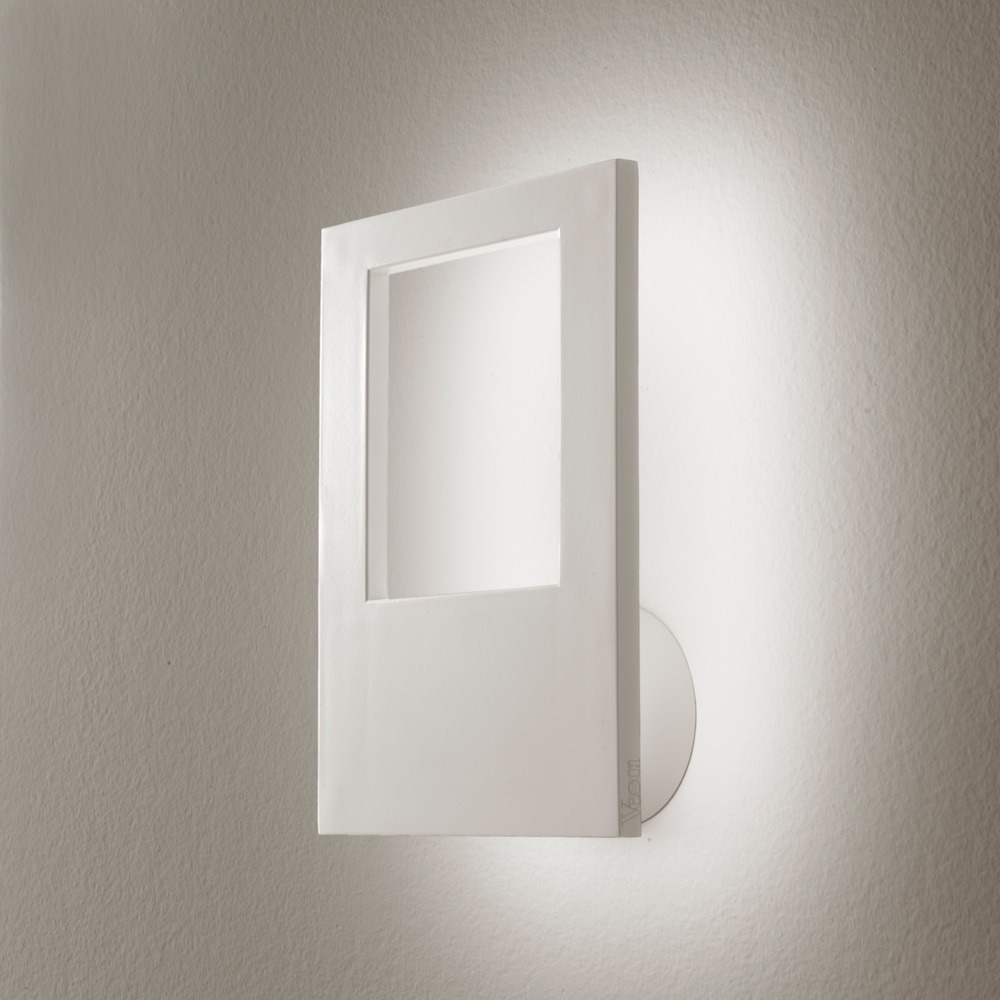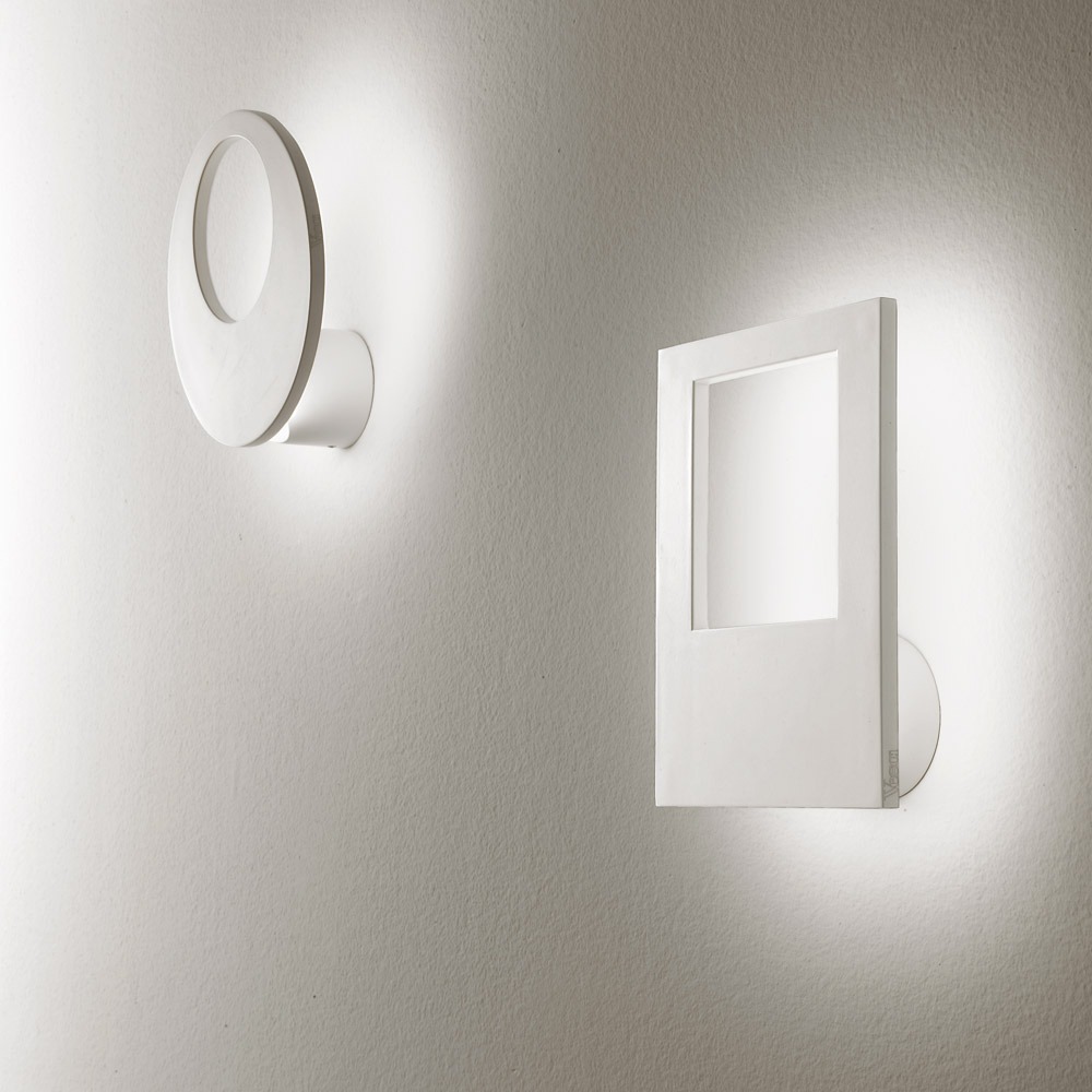 Wandleuchte aus Aluminiumdruckguss, indirektes Licht. Drehbar am Sockel um 100° mit 45° verstellbarem Schirm. Lackierung totalwhite oder totalblack.