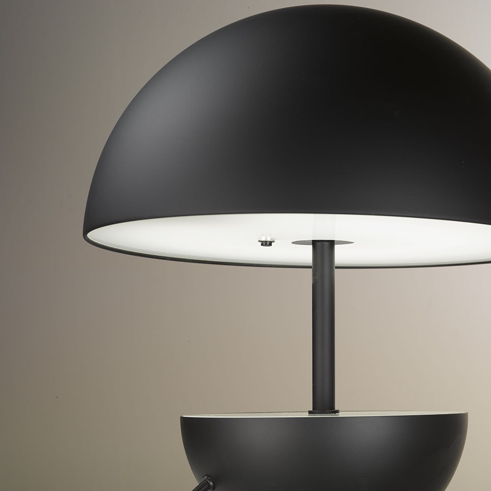 Tischleuchte mit Stahlrahmen in totalblack lackiert mit opalem PMMA-Schirm. Indirekte Abstrahlung mit integriertem LED-Modul, Ein/Aus-Schalter am Elektrokabel.