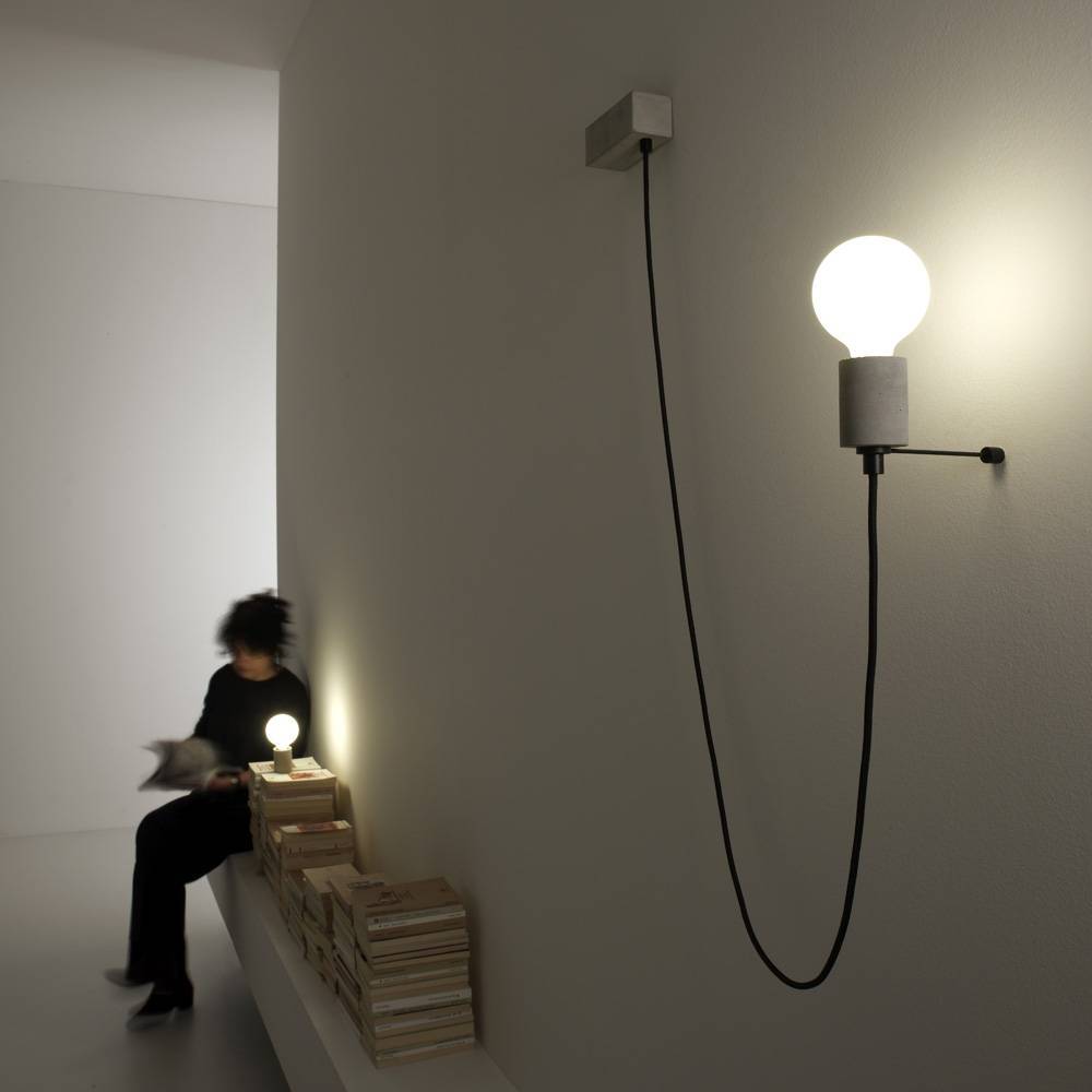 Dispositivo de pared con hilo que cubre los cables, estructura en cemento natural y cable elétrico en tejido negro. También con led incluido. Versión de pared con led de bienvenida y doble interruptor.