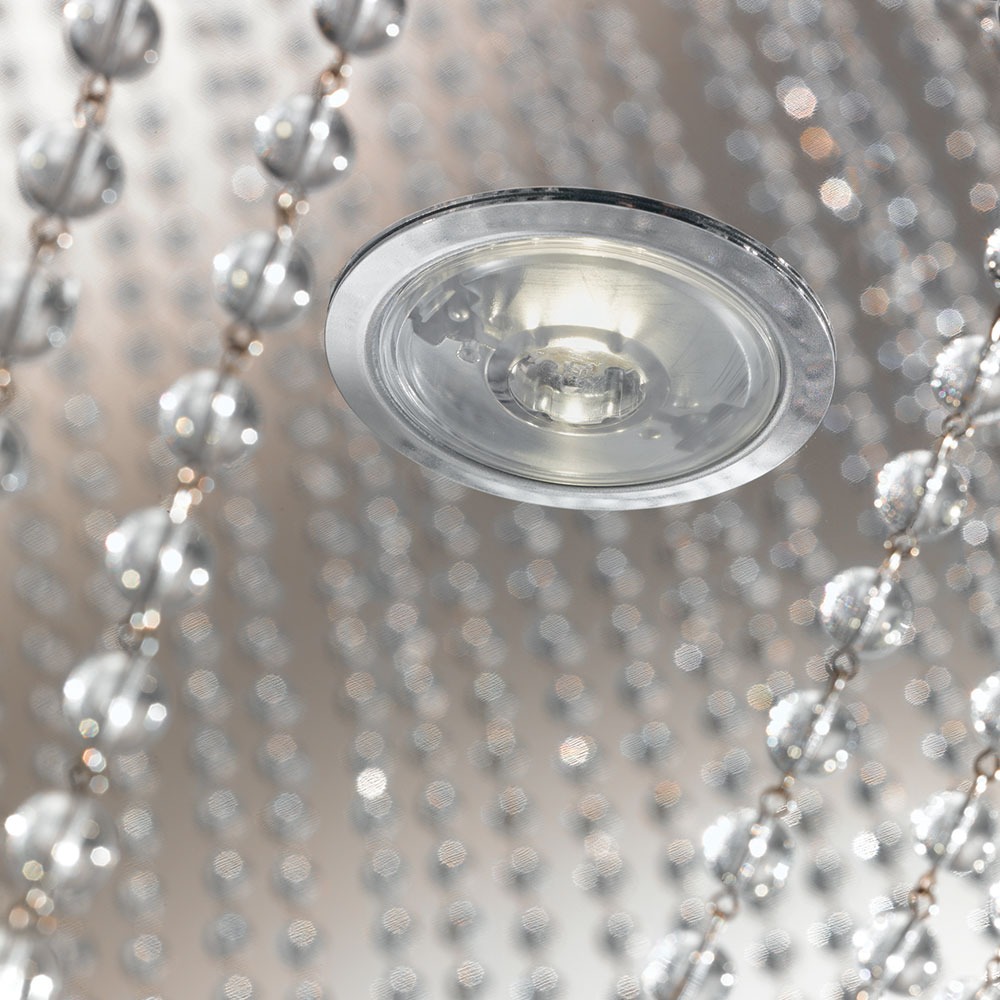 Dispositivo de techo con difusor en acero AISI 430 acabado natural. Elementos en vidrio recogidos en cadenas de color natural o negro. También en versión colgante ajustable en altura en cables de acero.