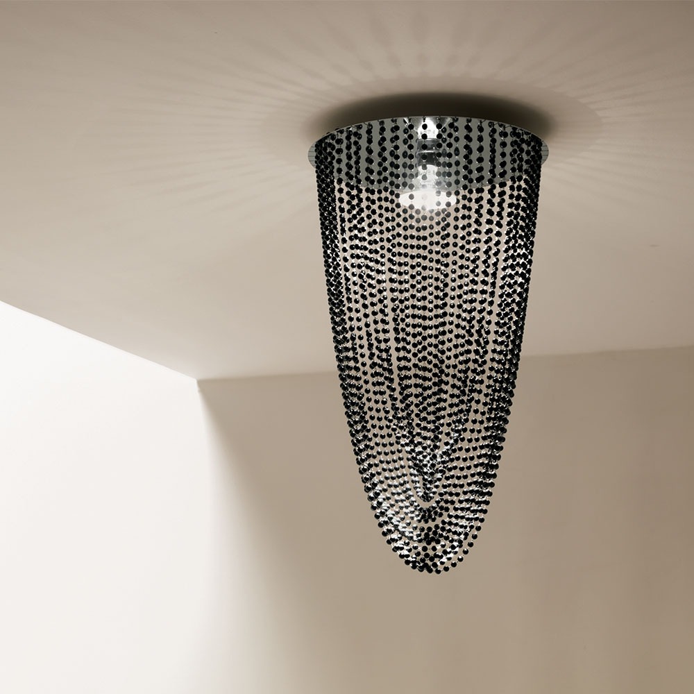 Dispositivo de techo con difusor en acero AISI 430 acabado natural. Elementos en vidrio recogidos en cadenas de color natural o negro. También en versión colgante ajustable en altura en cables de acero.