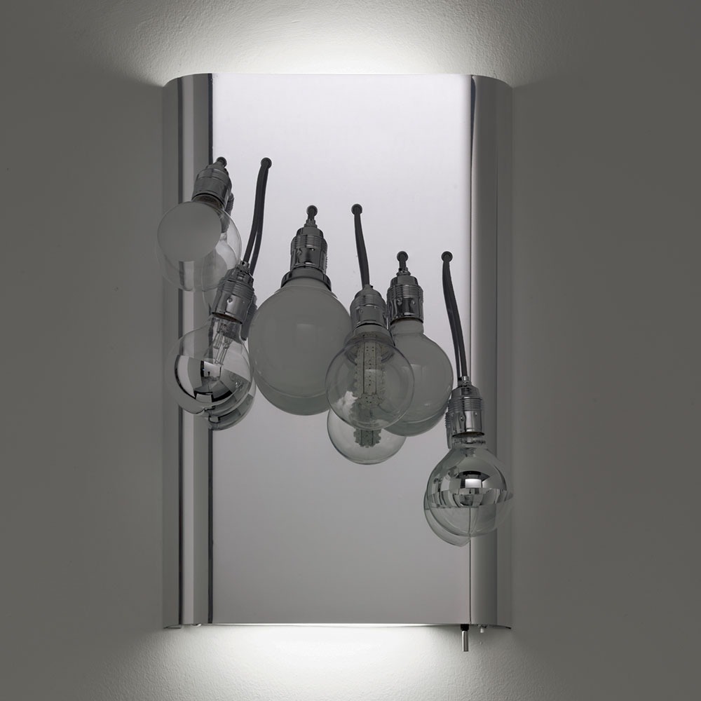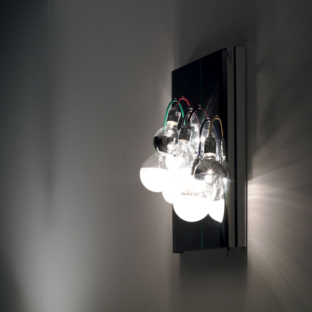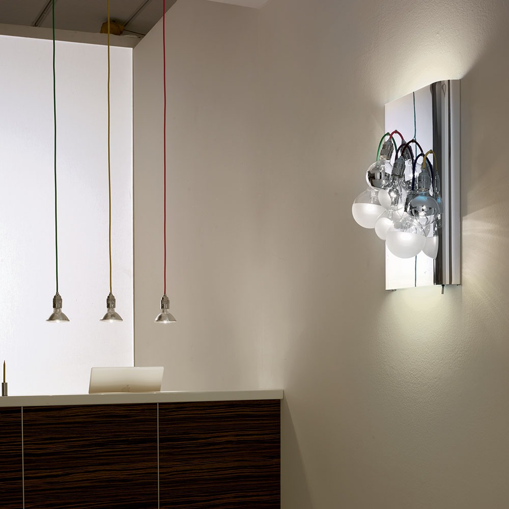 apparecchio a parete con struttura in acciaio verniciato invisibile e schermo in alluminio naturale lucido. illuminazione indiretta a parete con sorgenti fluorescenti e interruttore on/off sull’apparecchio. lampadine decorative con accensione dimmerabile on/off indipendente sulla parte inferiore dell’apparecchio. cavi rivestiti in tessuto multicolore.