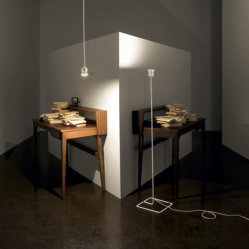 il vecchio portalampade E40 accoglie la sorgente e diventa struttura negli apparecchi da tavolo, pavimento e parete. corpo con finitura verniciato totalwhite o totalblack.