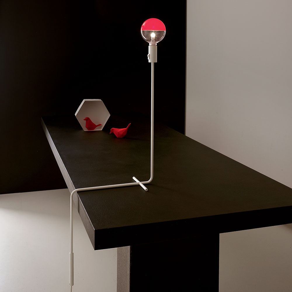 apparecchio da tavolo. struttura in acciaio o ottone. finiture verniciato, galvanizzato o ottone grezzo. modulo led integrato con on/off e driver su spina. anche in versione E27 on/off. a richiesta dimmerabile.