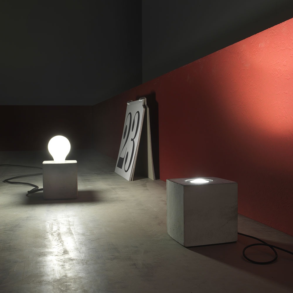 apparecchio da tavolo, pavimento, anche con fissaggio a soffitto su carrucola. elementi in cemento colato. versione E27.